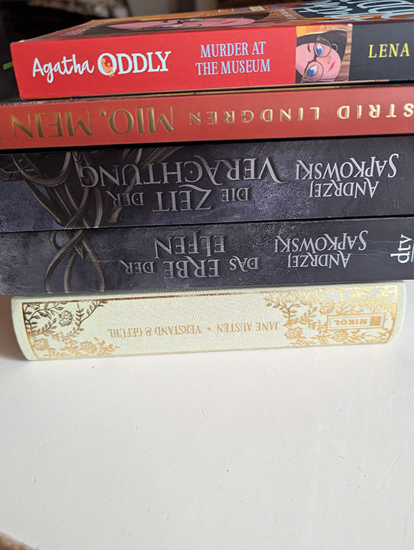 5. Bald war dann Kind 2 zu Hause und nach einer kleinen Mahlzeit (Brot und Gemüse) war es Zeit für unsere Lesestunde. Kind 2 ist inzwischen beim 2. Band Agatha Oddly und als neues deutsches Buch liest er Mio mein Mio. Ich bin immer noch bei Verstand und Gefühl, allerdings ist mein Sternenglanz nun durch und stattdessen geht es mit dem Hexer weiter. Allerdings hab ich eins der Bücher schon fast durch und ich wusste nicht mehr welches. Da die Zeit dann doch nur für Verstand und Gefühl reichte, ist diese Frage leider immer noch nicht beantwortet. 😆