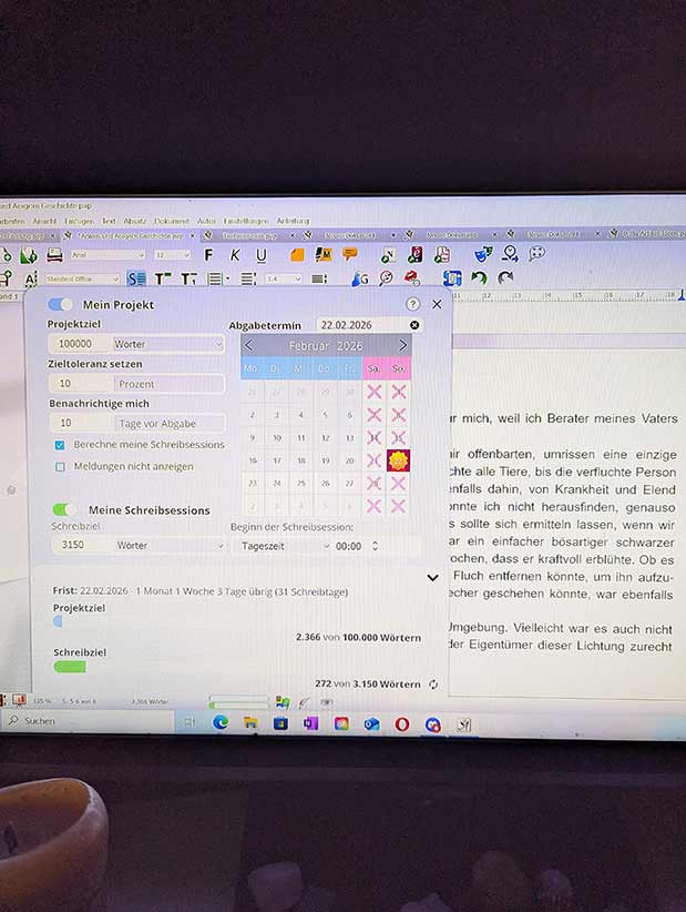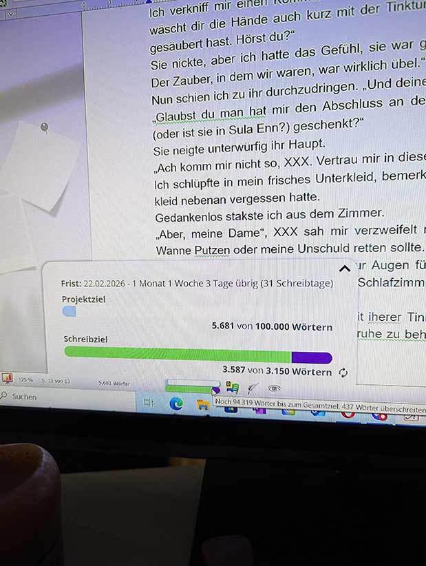 Es ist zappenduster und ich versuche meine mindestens 1000 Wörter zu schreiben. Ideen sind da, aber – hach – lassen die sich schwer aufschreiben, wenn die Lider noch so sehr zusammen kleben. Ich lerne gerade meine beiden neuen Protagonisten kennen, als mir auffällt, dass ich mir für das neue Projekt noch gar keine Zielvorgaben gesetzt habe. Das holen wir schnell nach. Wir werden hier bestimmt 100000 Wörter veranschlagen können. Auf geht’s.