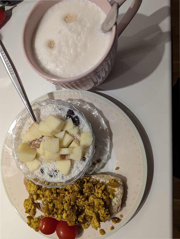 Frühstück und Klärung, wer zur Schule fährt, wer nicht und wenn ja wie. Fazit: Kind 1 ist krank und bleibt zu Hause, die Nachbarin fährt spontan ihre Kinder zur Schule und nimmt Kind 2 mit. Stellt sich jetzt nur noch die Frage, wie sie bei dem angekündigten Unwetter (Glatteis) nach Hause kommen. Wir bleiben gespannt. Es gibt Tofu-Rührei von gestern auf Brot und eine Minischüssel Haferflocken. Man kann ja sagen was man will, aber nach so einem Becher Kaffee sieht die Welt doch gleich ganz anders aus.