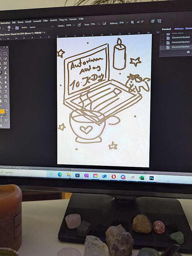 - 17:45 Uhr: Die Illustration ist fertig. Ich bin mit dem Ergebnis zufrieden. Es hat Luft nach oben. Aber mir gefällt es. Besonders das Einhorn.