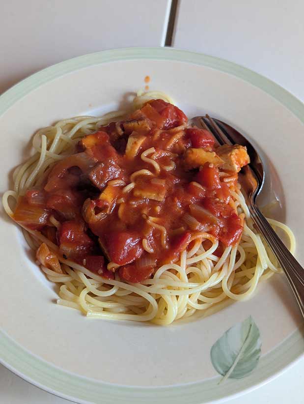 - 13:12 Uhr: Ich unterbreche die Arbeit an der Illustration für einen Zwischenstopp in der Küche. Sohn 2 ist eine Stunde früher aus der Schule zurück als erwartet. Man hat wegen der Wetteransage vorsorglich die Kinder früher nach Hause geschickt. Dank Schulbus hat er den Rückweg erfolgreich bestritten. Es gibt total einfallsreich Spaghetti.