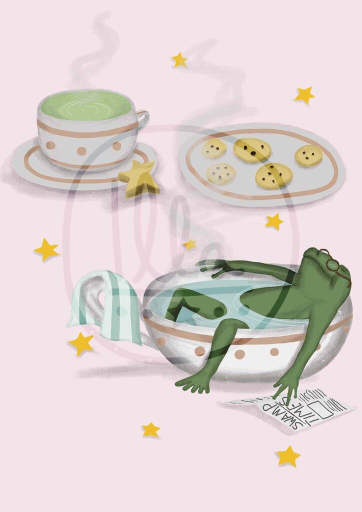 An dem Weihnachtszweig hab ich schon seit Beginn November gesessen. Und der relaxte Frosch ist tatsächlich schon im Oktober in den ersten Zügen entstanden, im Rahmen von Mimmimoos Illustration Club. Manchmal zieht sich eine solche Fertigstellung eben einfach hin. Aber ich bin froh, dass er fertig geworden ist. Er ist so wunderbar entspannt. Am liebsten würde ich mit ihm tauschen.
