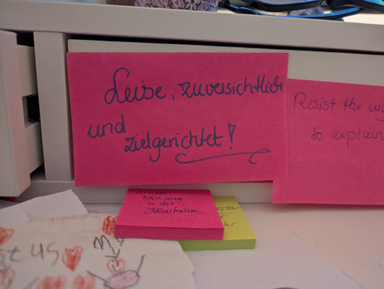 Zuversicht ist jedoch immer noch die Möhre, die vor meiner Nase hängt, und die ich scheinbar nicht erreichen kann. Sie meldet sich hier und da. Doch sie durchdringt mich nicht. Genau das hätte ich aber gern. Also fließt sie in mein Jahresmotto und klebt an meiner Schublade, am Schreibtisch.